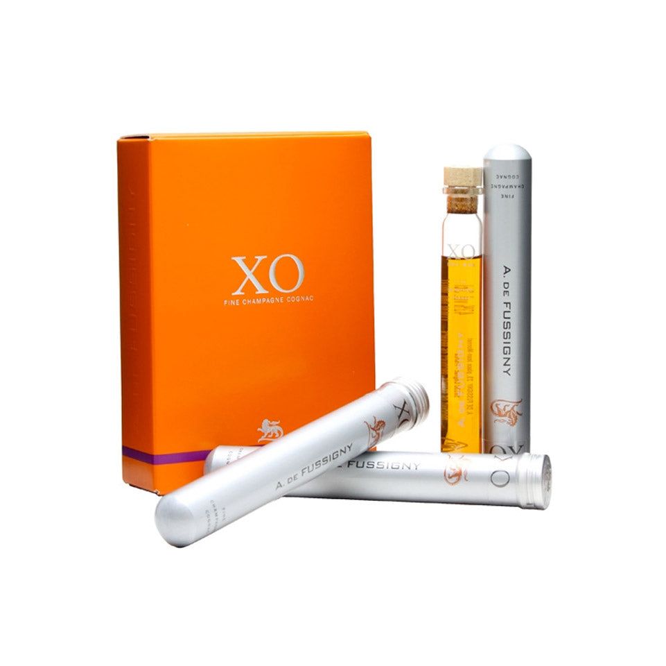 A gift set containing three 'doses' of A de Fussigny Fine Champagne XO For Men Cognac, presented in cigar tube bottles.