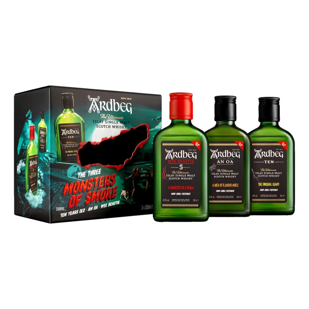 Containing a 200mL bottle each of Ardbeg's iconic smoky single-malt whiskies, the Monsters of Smoke trio unleashes flavour in a big way. Each collectable bottle is decorated with a unique artwork hiding beneath the label. Peel to reveal yours. Includes the flagship Ardbeg Ten Years Old, the feisty and youthful Ardbeg Five Years Old Wee Beastie and Ardbeg An Oa, an incredibly complex Islay scotch finished in three different types of cask.