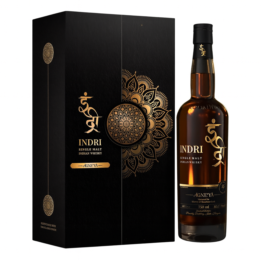 Produced in small batches at the esteemed Indri Distillery in Haryana, Agneya—meaning “born of fire”—expresses a rich and confident flavour profile. Aged in hand-selected oak casks, it reveals layers of toasted wood, caramelised sweetness, dried fruit, and subtle spice, culminating in a smooth, lingering warmth.