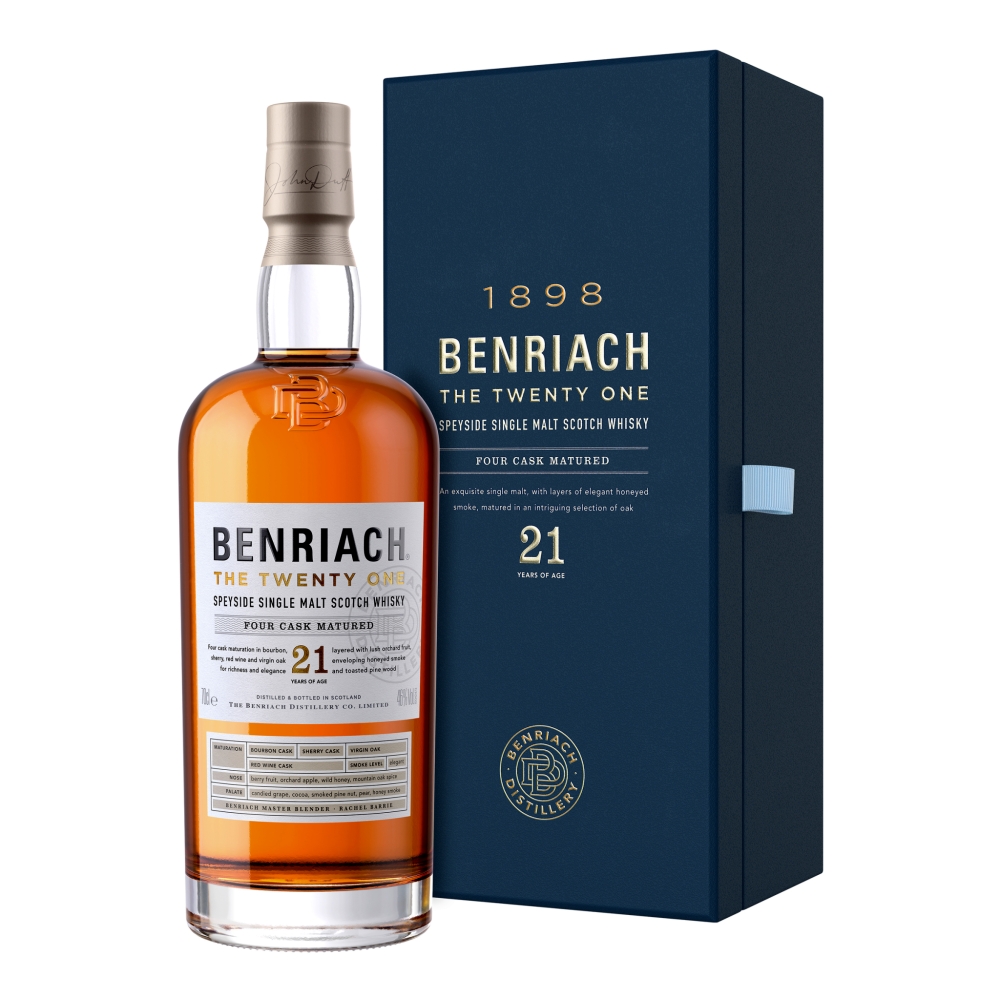 This exquisite single malt has been crafted from a combination of unpeated and peated spirit and four cask matured for at least twenty one years in bourbon barrels, sherry casks, virgin oak casks and Bordeaux red wine casks. During long maturation Benriach’s sweet Speyside smoke mellows and integrates with the fruit, malt and oak. After twenty one years, rich layering develops into an elegant honey smoke, enriched through multi-layered cask maturation. The whisky from each cask type, imbued with particular flavour characteristics, is then expertly married together to create a rich and elegant single malt, layered with lush orchard fruit and toasted pine wood with a honey smoke finish. All in perfect balance.