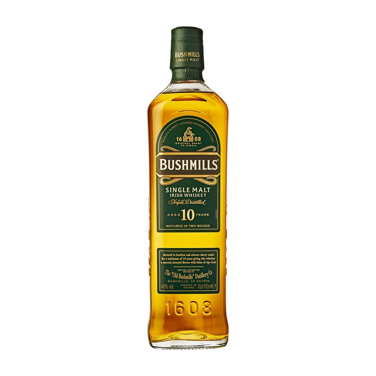Bushmills 10 Year Old Single Malt Whiskey is triple distilled from 100% malted barley and matured for at least 10 years in sherry and bourbon seasoned barrels, which give it honey, vanilla and milk chocolate flavours and is best served neat or over ice. We call it the perfect “summertime whiskey,” when poured over two ice cubes.
