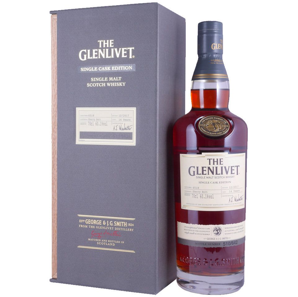 The Glenlivet 2003 vintage 14 years-old Speyside Single Malt Scotch Whisky was personally selected by the Glenlivet Master Distiller, distilled in the year 2003 and bottled in the limited single cask edition exclusively for Germany after 14 years of maturation in a sherry butt with cask no. 4518 in December 2017 without added dyes and chill filtration of 642 indivudally numbered bottles at natural cask strength 60.1% vol.