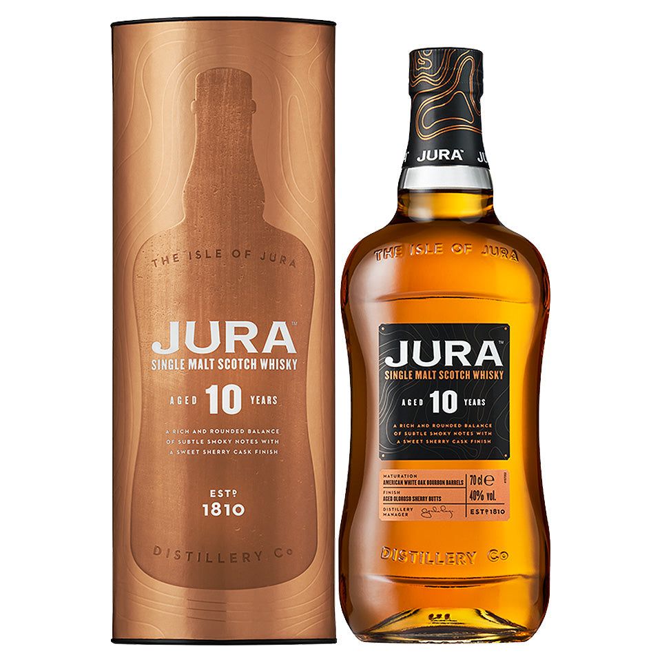 A whisky only Jura could make, born of our island and still produced today in a bottle originally shaped to withstand the roughest of journeys from our home. Crafted in exceptionally tall stills and matured for 10 years in America White Oak ex bourbon barrels.