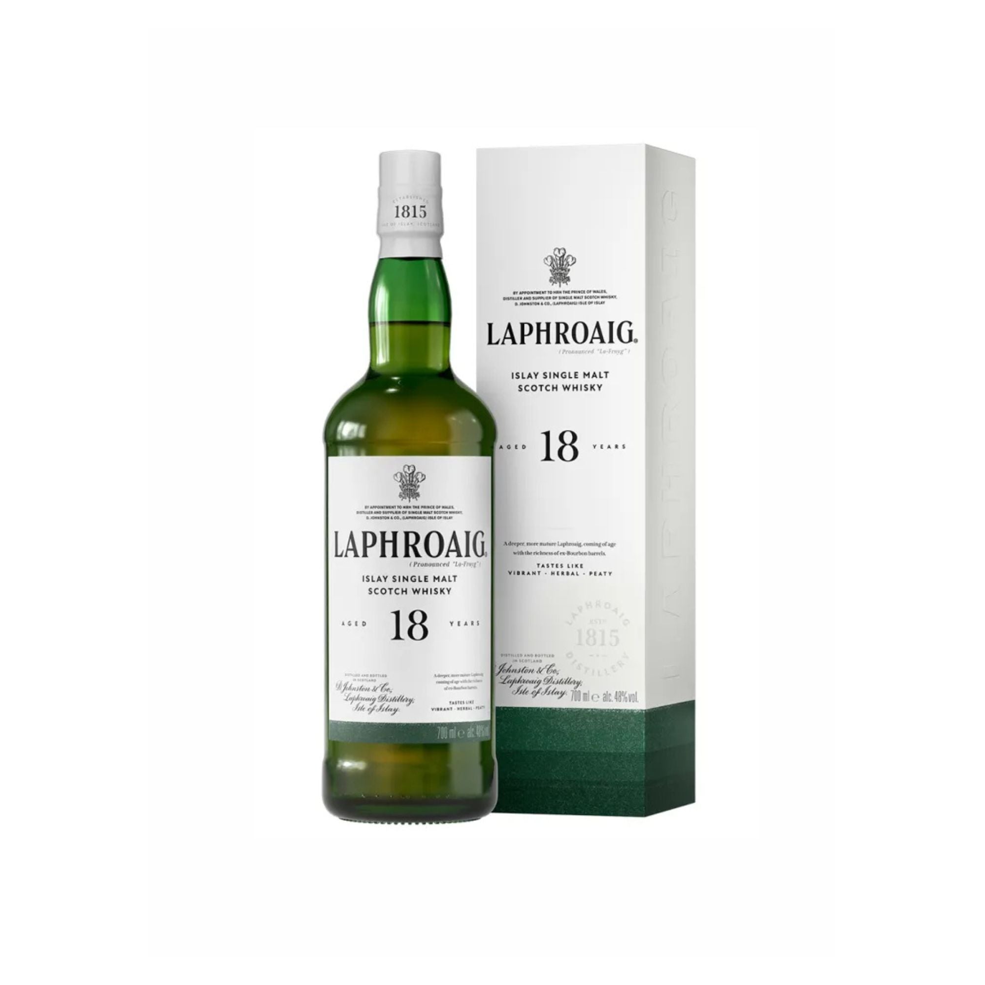 Laphroaig 18 Year Old Single Malt Scotch Whisky is a masterpiece of Islay craftsmanship, celebrated for its depth and sophistication. Aged to perfection, this expression offers a refined take on the bold, peaty character that defines Laphroaig.  The whisky greets you with a captivating nose of rich smoke, intertwined with notes of sweet toffee, dried figs, and a touch of vanilla, all underpinned by a distinctive maritime brininess. On the palate, it is exquisitely smooth and full-bodied, unveiling layers of smoky peat, honeyed malt, dark chocolate, and a gentle spice, complemented by a whisper of citrus zest. The finish is long and warming, with echoes of oak, sea salt, and sweet smoke lingering beautifully.