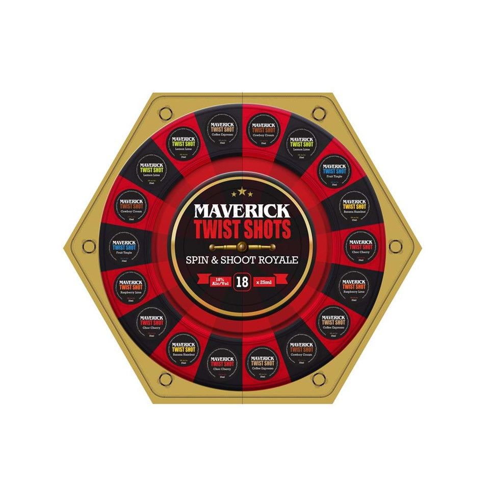 Perfect for a party, great value including 18 maverick shots with 7 flavours including Choc Cherry, Banana Hazelnut, Cowboy, Raspberry Pine, Lemon Lime, Coffee Vanilla and Fruit Tingle.