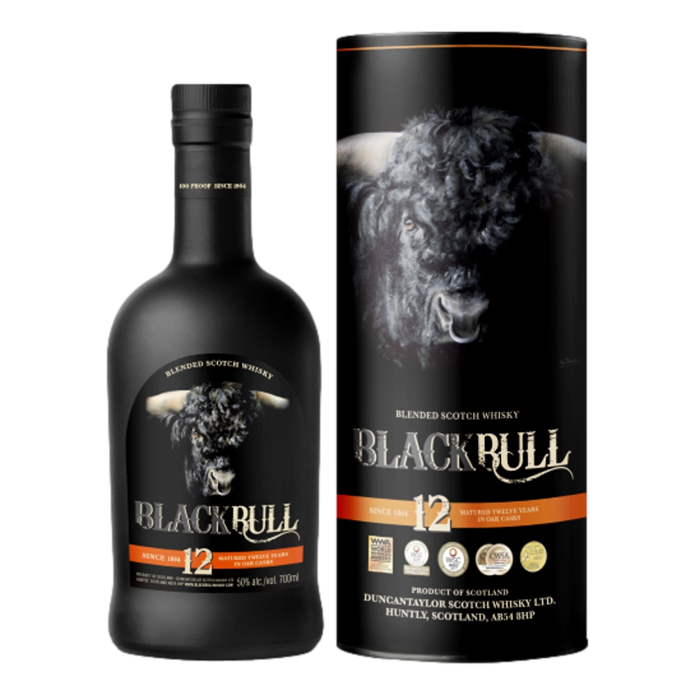 The quintessence of the Black Bull range. The 12 Year Old weighs in at a punchy 50% abv – a real contender for the prize list. This blend is a marriage of Malt and Grain that has undergone a 12-year maturation in refill ex-bourbon American oak hogsheads and finished in ex-Oloroso European butts. This nurtured and cultivated Highlander demonstrates a nutty sherry influence with the Black Bull chocolate so brace yourself for a full-on flavour experience that will rampage all over your senses.