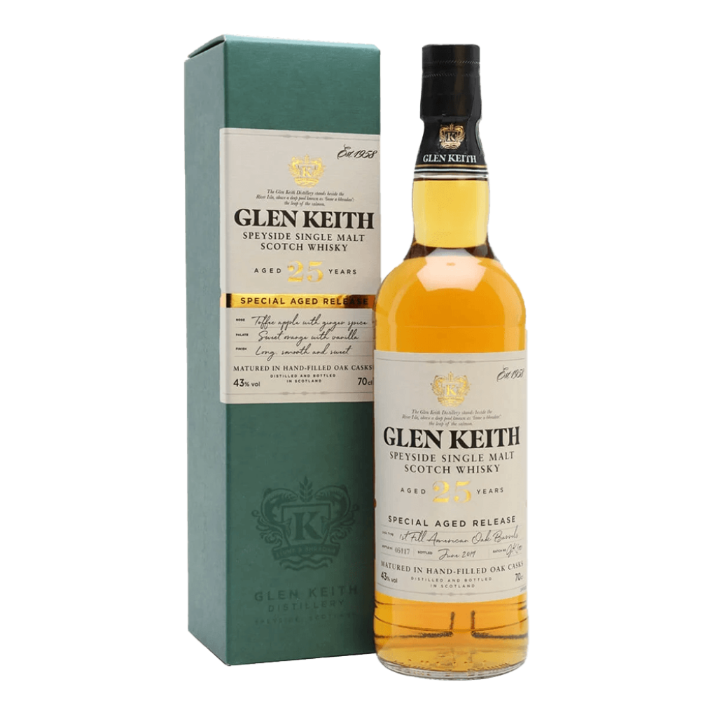 Glen Keith was built beside the Linn of Keith in 1959, next to the ruins of Milton Castle, using local stone.The distillery sources water from springs on Balloch Hill and they use lightly peated malted barley. Originally designed for triple distillation, it changed over to double distillation in 1970. The stills are slender with long, upward-angled lyne arms, influencing the distillate's light and fruity character. Mothballed in 1999, it was reopened by new owners, Pernod Ricard in 2013 after a complete refit, which included a new mash tun and washbacks.