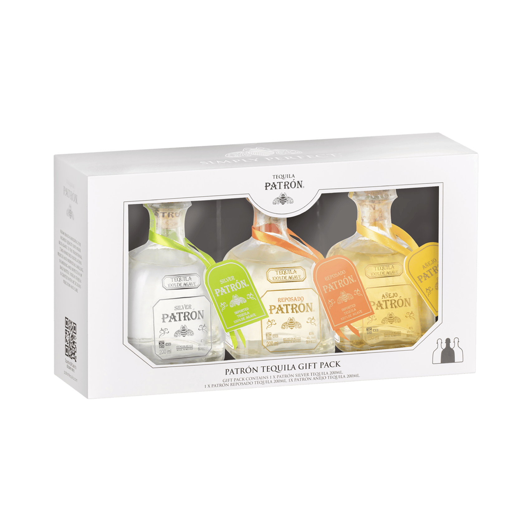 From hand-harvesting the highest quality 100% weber blue agave. To the traditional time-honored distillation process and individual labelling, numbering and inspection of each bottle. patron Tequila is crafter with meticulous precision and care. Patron Silver - Unaged with notes of fresh agave and citrus Patron Reposado - Aged at least two months for smooth taste with a hint of oak flavour Patron Anejo - Aged in white oak barrels for a minimum of 12 months to produce a tequila perfect for sipping. Gift Pack contains: 1 x Blanco Tequila 200mL, 1 x Reposado Tequila 200mL and 1 x Anejo Tequila 200mL.