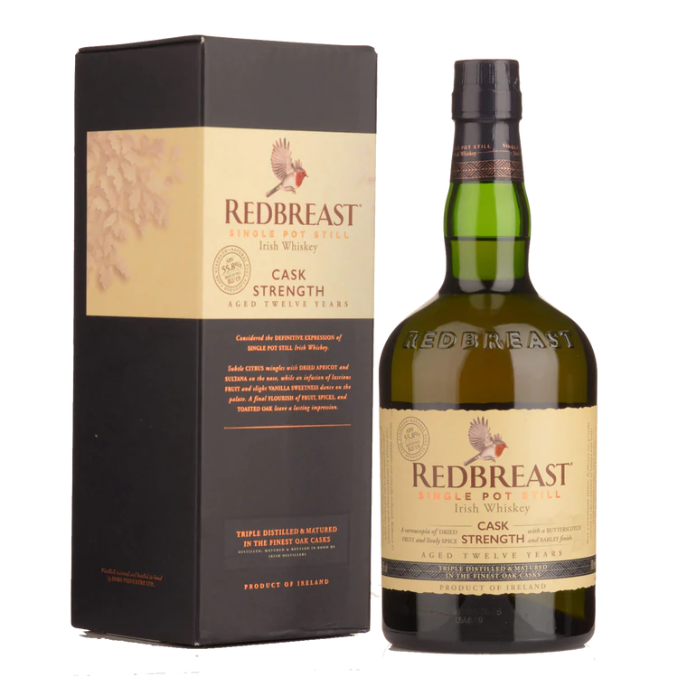 Made from a mash of malted and unmalted barley and then triple distilled in copper pot stills. Redbreast 12 displays the characteristic full and complex flavour of pot still whiskey, with the distinctive influence of pot still whiskey, which has been matured in sherry casks. The legendary sherried Redbreast style is a joy to behold in each and every bottle. This very special cask strength expression gives a rare glimpse of Redbreast 12 in its natural, full flavoured state.