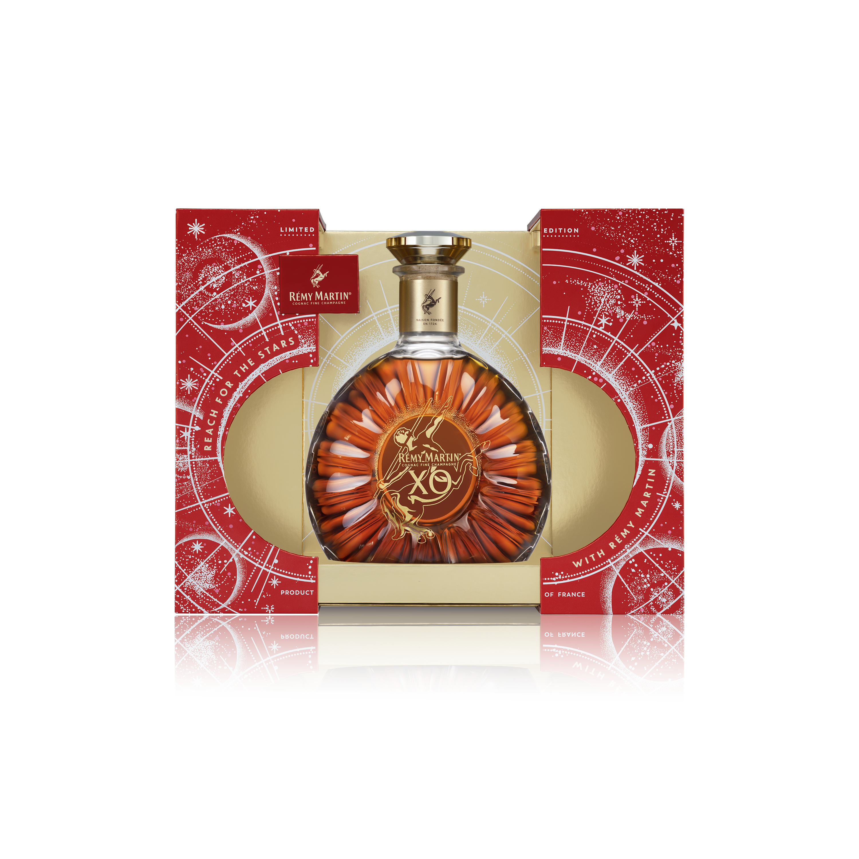 Elevate your celebrations with the Rémy Martin XO Reach For The Stars Limited Edition Cognac, a true embodiment of luxury and artistry. Encased in an exquisite bottle adorned with intricate red and gold details, this stunning edition captures the essence of festivity and sophistication.