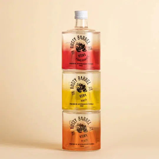 Our Rusty Barrel Flavoured Vodka comes in 6 bold flavours available in 2 stacks of 3 x 250ml bottles. Flavours include punchy peach, spicy pear, juicy mango, bold blackberry, tangy pomegranate and a classic vanilla that is anything but vanilla.