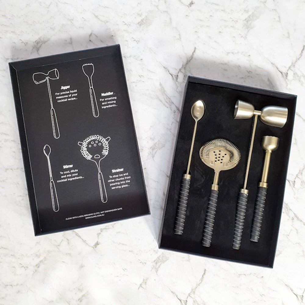 The set contains a jigger, stirring spoon, muddler and strainer. For the whole cocktail caboodle, don’t forget to grab the matching Cocktail Shaker.
