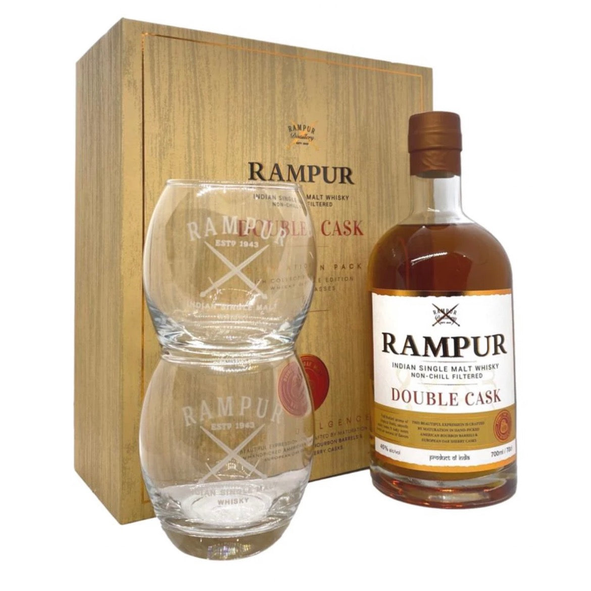 The newest jewel in the collection is the Rampur Double Cask Indian Single Malt Whisky Non-Chill Filtered. This beautiful expression is crafted by maturation in handpicked American Bourbon barrels & European Oak sherry casks. Delicate balsamic vanilla notes from the American white oak compliment the full-bodied aroma; Rich caramel, dried dark fruits and spicy tonality from European oak add to the depth.