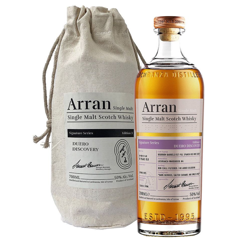 With Signature Series Edition 3 'Duero Discovery', you'll discover the influence of an excellent quality wine cask on our Arran Single Malt. The red wine casks used in this bottling were previously used to mature wine from the wine-producing region along the Duero River, in northern Spain, before they arrived with us in Lochranza.
